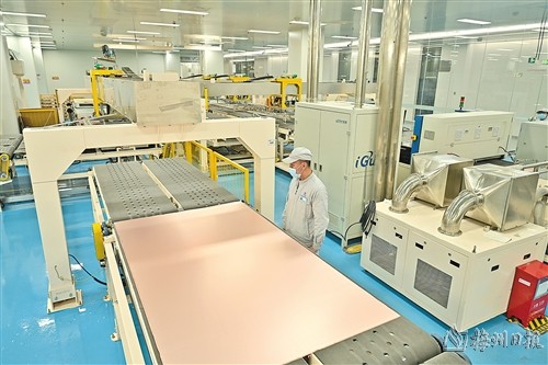 走進平遠高新區的廣東盈華電子材料有限公司(下稱“盈華材料”)高性能覆銅板項目二期廠房內部,偌大的生產車間寬敞明亮、幹淨整潔,工作人員對回流裁切線和疊合區的設備進行著聯機調試,一張張堆疊好的覆銅板通過自動小車運送到下一步工序機器上。