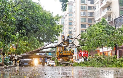 記者在新中路、正興路、梅江二路、環城路等地看到,不少行道樹被大風吹倒,或倒伏在路麵,或壓在停車線內的汽車及摩托車上,還有一些行道樹的樹枝被吹折,搖搖欲墜,不僅嚴重阻礙交通,還存在安全隱患。為此,相關工作人員在做好安全措施的情況下,冒著雨迅速趕赴現場放置錐形筒、拉起警戒線,將倒伏的樹木進行修枝後轉移,並及時清理倒落在路麵的樹枝。