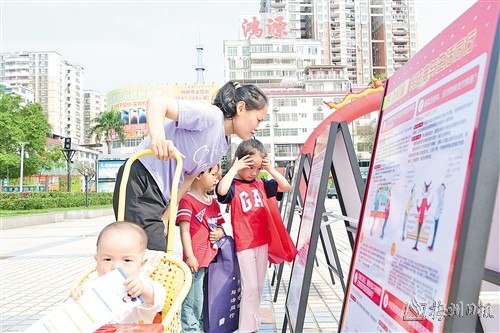 家長在展板前給小朋友們講解國家安全相關知識。(黃偉金 攝)