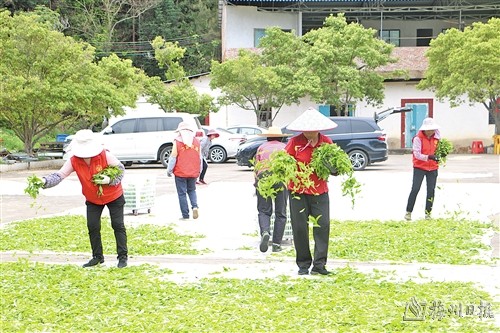 采茶時節,在興寧市徑南鎮官亭村的晨露茶葉種植基地,幾十名茶農熟練地采摘著春茶。“我們在官亭村、黃坑村等地建立了茶葉種植基地,引進高香型茶葉新品種,采用無公害標準化種植,並采取‘公司+合作社+基地+農戶’的模式,輻射帶動本村及周邊區域茶農。”廣東晨露茶文化旅遊產業園有限公司負責人張新秋告訴記者,該公司去年春茶幹茶產量超過7萬斤,今年又有部分茶樹進入豐產期,預計春茶幹茶產量可超過10萬斤。