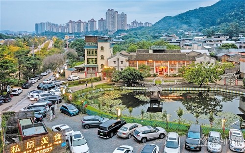 夜幕降臨,位於梅江區三角鎮泮坑村的又見·鈞質樓民宿燈火通明,停車場基本停滿,特色餐廳人氣頗高。又見·鈞質樓民宿毗鄰客天下旅遊風景區和泮坑旅遊風景區,由80多年曆史的客家圍龍屋改造而成,既保留了客家風情,又有現代工藝韻味,因交通便利、設計獨特而受到遊客青睞。該民宿相關負責人告訴記者,假期前三天客流量每天200人左右,主要來自珠三角地區。
