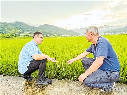 劉曉波(左)和種植大戶鄭漢能在查看水稻長勢。(洪國棟 攝)