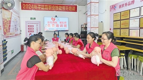 與此同時,在梅州市非凡家政服務有限公司,一場針對農村婦女的月嫂培訓也在緊張進行。學員們正在學習催乳技巧、嬰兒日常護理以及母嬰營養餐的製作,現場氣氛熱烈而專注。