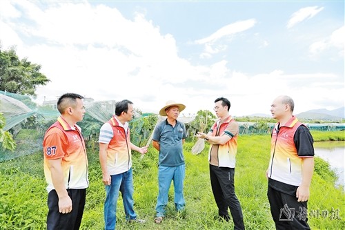 廣州市荔灣區駐梅縣區佘江鎮幫鎮扶村工作隊在佘江鎮鹹和村了解產業發展情況。(吳麗伶 攝)
