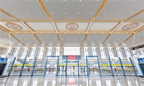 興寧南站候車大廳點綴花燈、圍屋等元素造型的裝飾。