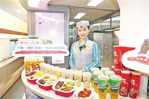 試運行列車上,乘務員展示梅菜扣肉等具有梅州特色的套餐。(高訊 攝)