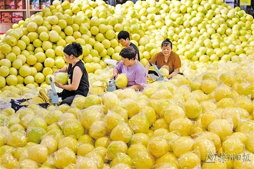 梅州萬川千紅農業發展有限公司的柚倉裏,工人正忙著包裝蜜柚。