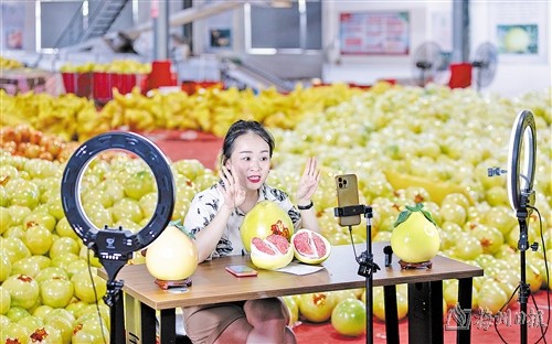 梅州萬川千紅農業發展有限公司柚倉裏,主播正在直播帶貨。
