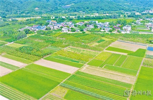 九嶺村的田地連成片,田裏的作物長勢喜人,呈現出一片生機勃勃的景象。(林翔 攝)