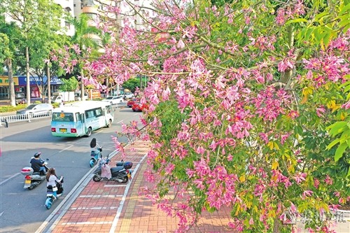 10月下旬,梅城街頭的美麗異木棉迎來花期,雲霞般的粉紅色花朵綴滿枝頭,成為秋日裏一抹抹靚麗的景致。