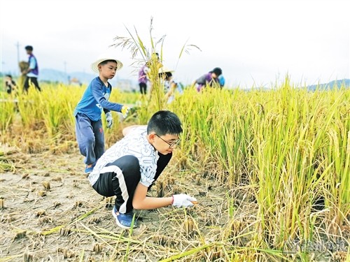 參加活動的孩子們在收割稻子,體驗田間辛勞和收獲的喜悅。(通訊員供圖)