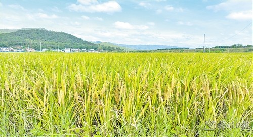 蕉嶺縣新鋪鎮尖坑村連片的農田稻浪翻滾,稻穗顆粒飽滿。