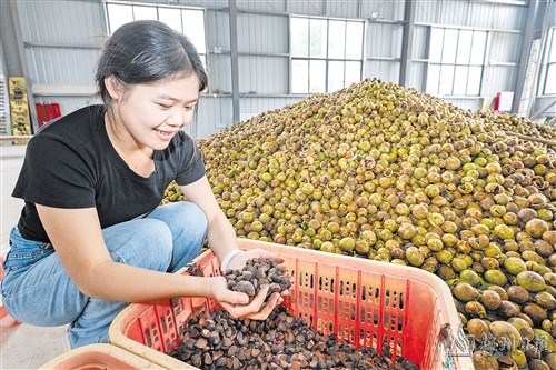 穗瑞農林油茶生產車間裏,工人正在查看剝皮後的油茶籽質量。(連誌城 攝)