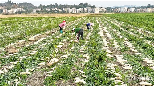在五華縣梅林鎮梅東村,農戶搶抓農時采收蘿卜。(賴鋒 攝)