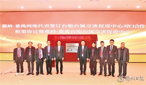 大會上舉行蕉嶺番禺兩地代表簽訂台胞台屬交流促進合作框架協議暨蕉嶺番禺台胞台屬交流促進中心揭牌儀式。(林翔 攝)