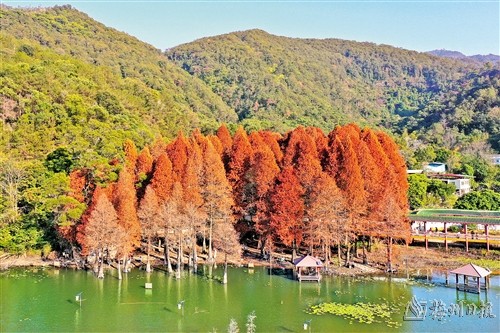 冬日時節,位於梅城泮坑旅遊風景區內的落羽杉也漸漸染紅,吸引大批遊客紛至遝來,欣賞獨屬於這個季節的美景。