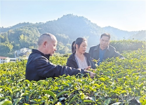 徑南鎮幹部在茶園跟茶農探討新洲村茶產業發展情況。(陳思傑 攝)