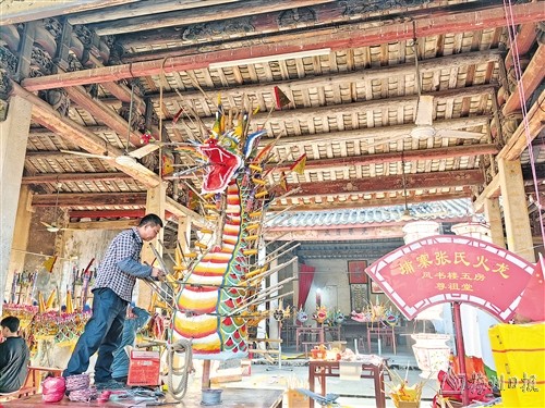 記者在埔寨鎮的尊祖堂、遠三和祠堂看到,“火龍”製作已基本完工,現場工作人員正在進行給“火龍”裝火藥等最後工序。據了解,今年元宵節,埔寨鎮將有三條“火龍”鬧元宵。