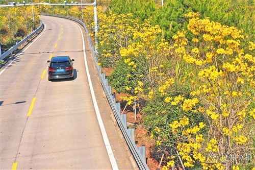 春風和煦,石正鎮高速路口的黃花風鈴木迎春綻放。(鍾小豐 攝)