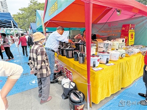 在家電以舊換新攤位前,不少市民帶來了家裏的舊電飯鍋、電磁爐,駐足選購,在導購員試電確認沒有質量問題後,心滿意足地拿著新選購的電器回家。