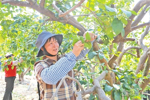 在桃堯鎮鴻嘉生態農業種植基地,數百畝盛開的柚子花潔白似雪,清新的花香彌漫整個果園,工人們在柚子林裏來回穿梭,將每棵樹的柚花疏減至最合理的狀態,然後再小心翼翼地拿起用毛筆自製的“授粉器”把酸柚等授粉樹的花粉點在綻開的金柚雌花柱頭上,授過花粉的花上,都有一個明顯的紅點點。“我種柚樹30多年了,每年柚花開的時候都要請不少工人來幫忙疏花授粉,這個環節雖然很耗費人工,但能最大程度保證柚子的坐果率,一點也馬虎不得。”基地負責人張小宗說。