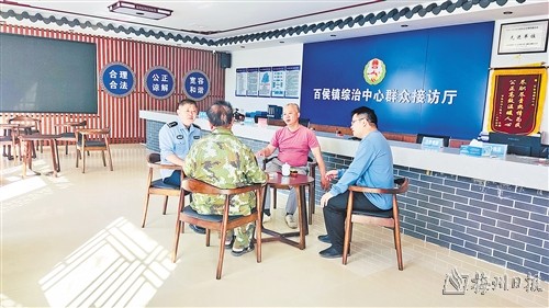 在百侯鎮綜治中心內,調解人員正在進行矛盾糾紛調解。