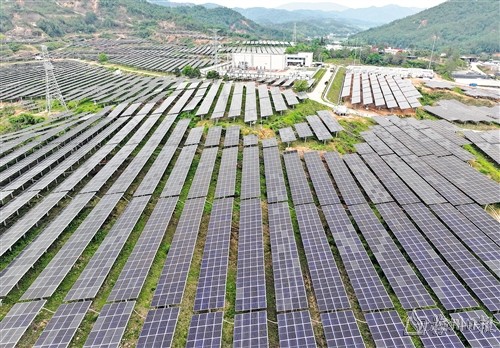 廣東能源梅州平遠光伏複合項目(一區),一排排光伏板隨著山勢整齊鋪開。(高訊 攝)