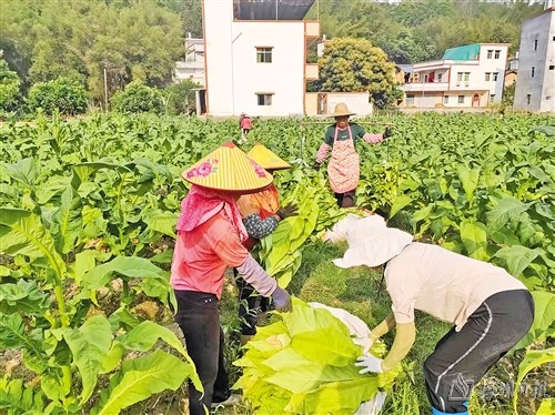 五華縣華城鎮農戶在煙田采收煙葉。(梅州市全域農林科技發展有限公司供圖)