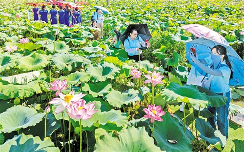 遊客和徒步愛好者在新圩鎮藍布村的荷花基地賞荷、拍照打卡。(圖片均為連誌城攝)