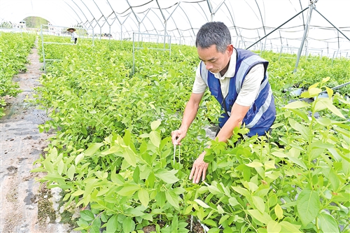 姚強查看被稱為“林下仙草”的鐵皮石斛生長情況。
