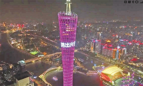 今年1月,大灣區地標建築廣州塔的巨幅LED屏滾動呈現“食在廣東·鴿出興寧”“過大年·吃興寧鴿”的標語。(興宣供圖)