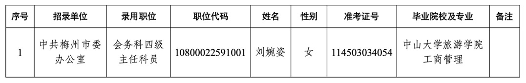 根據《中共廣東省委組織部、廣東省人力資源和社會保障廳關於印發<廣東省2025年度選調優秀大學畢業生資格審核、麵試和體檢等工作實施方案>的通知》(粵組通〔2025〕3號)、中共梅州市委組織部《關於做好我市2025年度選調優秀大學畢業生考察審批工作的通知》等文件要求,經過報名、推薦、資格初審、筆試、資格審核、麵試、體檢、考察等程序,經市委辦公室室務會會議研究同意,確定劉婉姿同誌為市委辦公室2025年度選調優秀大學畢業生擬錄用人員,現予以公示。公示時間:2025年4月10日至4月16日(5個工作日)。公示期間,歡迎群眾來電、來信、來訪反映情況。