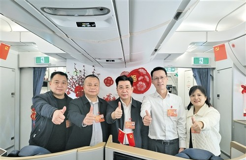 我市全國人大代表(左起:葉繼聯、鄒錦開、王暉、張曉、張春梅)登機赴京參會。(受訪者供圖)