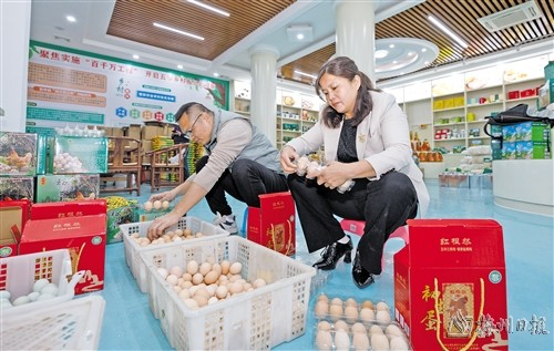 “產業村長”張春梅與員工一起打包雞蛋。(林翔 攝)