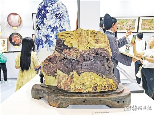 參展期間,我市選送的作品——蔣向華創作的石雕《天下》獲“中國工藝美術文化創意大賽”銀獎。據介紹,該作品原材料使用的是梅州本地的葉蠟石,長80厘米、寬23厘米、高57厘米。“我在青黑雙色葉蠟石上進行創作,雕刻出千古一帝立於長城之上的形象,用時半年左右。”蔣向華介紹說,該作品有古今時空轉換之意,既有宮殿車馬,也有火箭航母,體現出華夏文明繁榮昌盛。(記者 何梓瑜)