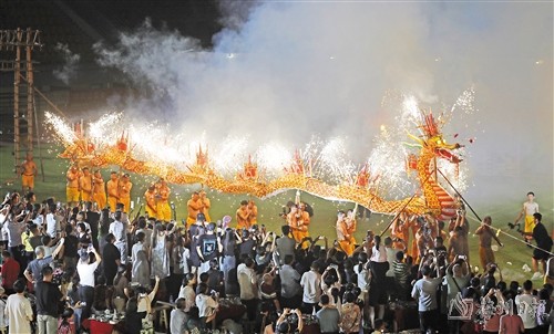 最後,一場盛大的燒火龍表演激情上演。表演者手舉火龍繞宴席一圈,龍身閃爍,發出色彩絢麗的火花,擎火龍的勇士們赤膊上陣,任由火花灑在身上。“太震撼了!我是定居在梅州的江西人,一看到有這麼隆重的活動就趕緊和朋友組隊參加了。在享受美食、欣賞表演的時候也通過網絡分享給了朋友們,希望讓更多人能看到這場盛宴,一起為梅州‘上分’。”參加活動的李莉珍告訴記者。