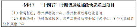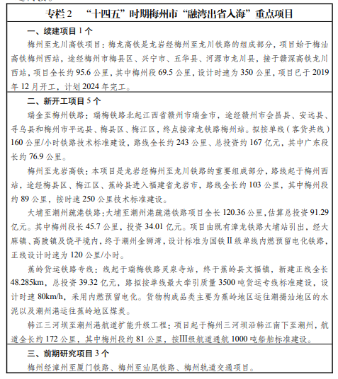 “十四五”期間梅州市綜合交通項目估算完成總投資約960億元,主要包括鐵路、高速公路、航道、國省幹線公路、縣鄉公路、重要經濟公路、機場、公交工程、公路客貨運樞紐及物流園工程等項目,具體詳見下表。
